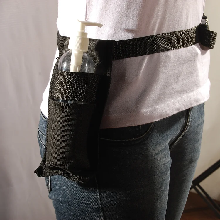 מתקן לבקבוק שמן למתניים. חגורת פאוץ' מרופדת מתכוננת. סגירת "קליק" מהירה. עשוי מבד ניילון ועמיד בפני שמנים. צבע שחור. מגיע ללא בקבוק.